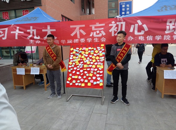 10月31日下午,兰州理工大学电信学院的在西校区红柳广场举办“学习十九大,不忘初心跟党走” 主题活动。大学生用签名留言的形式表达对学习十九大精神的心声和决心,一句句肺腑之言、一个个温暖小贴士,生动再现了当代大学生爱党爱国、立志成才的理想抱负。