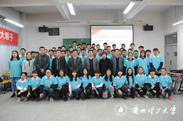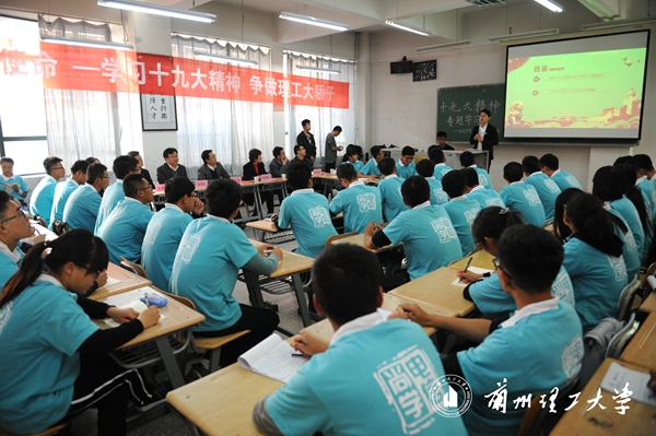 2017年11月1日下午,正值全校上下广泛热烈学习十九大精神之际,兰州理工大学党委书记夏天东来到电信学院,与2017级自动化1班的同学们一道参加“不忘初心,牢记使命---学习十九大精神,争做理工大骄子”主题班会,解读十九大报告,听取大家的学习心得,了解大学生党团组织建设情况。他希望同学们深入学习领会习近平新时代中国特色社会主义思想的精神内涵,不忘初心为人民谋幸福,牢记使命为民族谋复兴,提高思想认识,努力成长成才,为中华民族伟大复兴的中国梦贡献青春力量。电信学院,党委宣传部、学工部、校团委等单位和部门的负责人及部分教师、辅导员、班主任等参加学习活动。