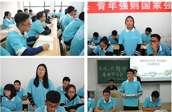 学习研讨环节,主持人带领大家分别从十九大重要意义和十九大报告内容解读两个方面,共同学习了十九大精神。重点学习了“中国共产党人的初心和使命”、“十个方面历史性成就”、“新时代坚持和发展中国特色社会主义的基本方略”等重要内容。学习过程中,同学们对照“圆梦时间表”,深有体会地表达了个人奋斗目标和时代憧憬。结合十九大报告中关于青年的相关论述,大家围绕“学习十九大精神,作为青年大学生应该怎样做?”的话题,分享了学习心得和体会,表示要从学习、生活等方面严格要求自己,充分发挥“自我管理、自我服务、自我教育和自我监督”的作用,努力成为德智体美全面发展的社会主义合格建设者和可靠接班人。学校党委宣传部和学工部的老师也与大家分享了自己学习十九大精神的感悟和收获。