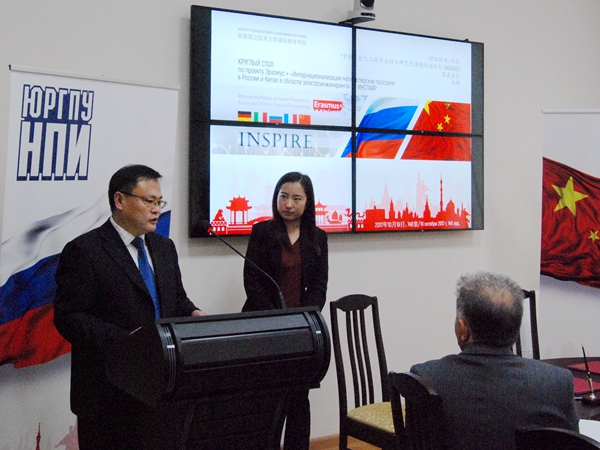 10月19日,在南俄国立技术大学Ersmus(伊拉斯谟)项目圆桌会议(即“俄罗斯和中国电工技术硕士课程国际化”项目论坛)上,王全进代表学校致辞。他指出,两校合作历史久远,合作领域广阔,希望通过双方的会晤交流,进一步总结经验,借力“一带一路”春风,为进一步提升两校合作层次和水平打下坚实基础。他简要介绍了兰州理工大学中俄电气化专业硕士课程国际化项目的进展情况,强调该项目2016年申报成功并获得欧盟教育委员会的批准立项及资助,是学校首次获得由外方独立资助的“中欧政府间合作交流计划”项目,现已取得初步成效。下一步将继续加强沟通,在联合培养硕士研究生等方面加强合作。南俄国立技术大学国际教育学院副院长科洛米耶茨、信息和测量系统与技术教研室的项目负责教师等做了交流发言。该校外语教研室布坚科教授回顾了南俄国立技术大学与中国伙伴院校的合作历史。会后,南俄国立技术大学电视台对王全进进行了视频访谈。