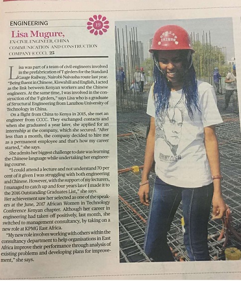 2015年,在从中国飞往肯尼亚的航班上,她遇到了一位来自CCCC的工程师并交换了联系方式。一年后Lisa毕业了,申请了公司的实习机会。“在不到一个月的时间里,公司决定雇用我作为一名正式员工,这就是我的职业生涯的开始”她说。