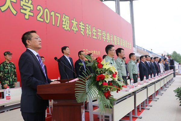 学校党委书记夏天东给军训团授旗,开学典礼圆满结束。