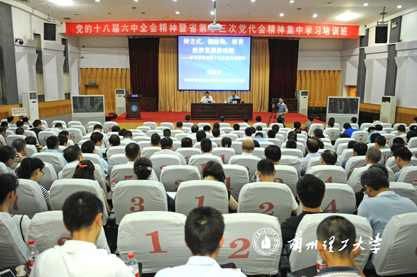 根据省委组织部《关于开展县处级以上领导干部学习贯彻十八届六中全会精神轮训工作实施方案》和《关于开展学习贯彻省第十三次党代会精神集中轮训的通知》精神,7月15日上午,兰州理工大学集中学习党的十八届六中全会精神暨省第十三次党代会精神干部培训班在逸夫科技馆开班。学校党委书记夏天东主持培训活动。全体在校校领导出席报告会,全校近300名管理干部参加学习培训。