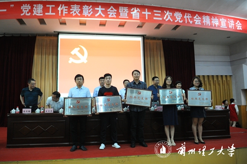 校领导为获奖先进基层党组织代表和优秀个人颁奖,四位获奖单位和个人代表在大会交流发言。