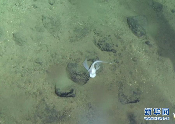 “蛟龙”号载人潜水器拍摄的狮子鱼在马里亚纳海沟游弋的画面