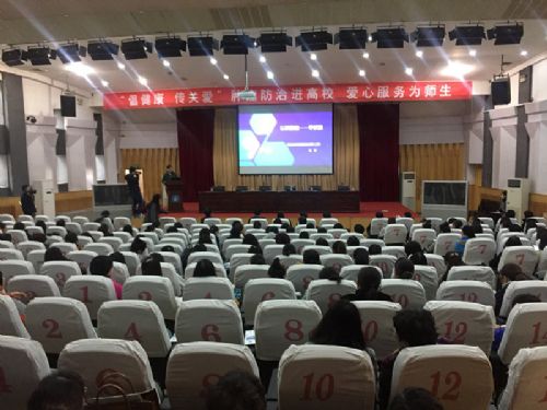 为迎接今年的“三八”妇女节,增强女教工的健康意识及自我保健能力,提高教职工的健康素养水平和生活幸福指数,3月6日下午,兰州理工大学工会邀请甘肃省肿瘤医院、甘肃省医学科学研究院党委书记郭峰及知名专家、各科室医务人员一行25人来校为广大女教职工开展了健康知识讲座和义诊活动。学校党委副书记丁虎生出席活动并讲话,学校纪委书记李香枫、七里河区疾控中心主任赵玲珑、七里河区西湖街道办工委书记郑先喜出席活动。讲座由校工会副主席张艳主持,300余名女教工到场聆听并参与活动。